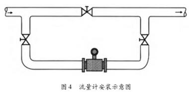 (6)安裝在工藝不允許斷流的管道上時(shí),應(yīng)考慮儀表的清潔和維護(hù),并應(yīng)安裝旁路管道(見(jiàn)圖4)。