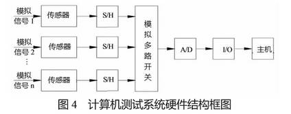 計算機測試系統(tǒng)硬件包括傳感器、AD轉換器、輸入/輸出接口電路計算機等[5]。負壓測試采用多路共享AD轉換方式,完成多個負壓值的測量。硬件系統(tǒng)結構如圖4所示。多個模擬信號通過傳感器連接到采樣1保持(S/H)設備,將待采集的信號發(fā)送到多路復用器。輸入 1 輸出 (I/O) 接口的最終數(shù)據轉換會將數(shù)字量傳輸?shù)街鳈C。
