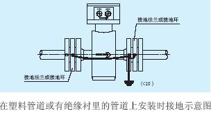 b.傳感器在塑料管道上或在有絕緣襯里的管道上安裝,傳感器的兩端應(yīng)安裝接地環(huán)、或接地法蘭、或帶有接地電極的短管,按下圖接地。