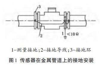 (4) 傳感器安裝在金屬管上,傳感器的接地線可按廠家要求接在管子兩側(cè)的法蘭上,形成可靠的接地回路(見圖1) .儀表的接地點(diǎn)應(yīng)為獨(dú)立接地點(diǎn),不得與其他用電設(shè)備的接地線連接。